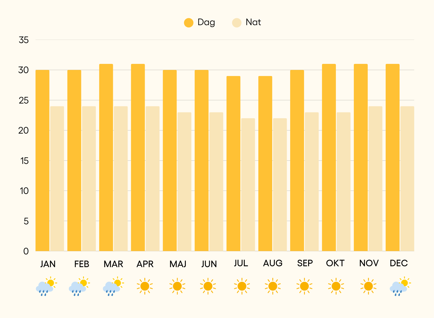 Maximal temperatur | 30 | 30 | 31 | 31 | 30 | 30 | 29 | 29 | 30 | 31 | 31 | 31 |