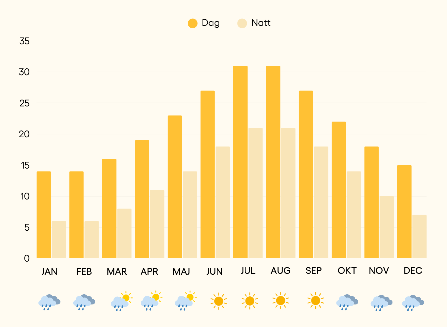 | Dagstemperatur | 14 | 14 | 15 | 17 | 22 | 26 | 29 | 29 | 26 | 21 | 17 | 15 |