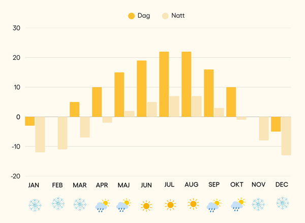 Vinter (december-februari): Temperaturen ligger ofta mellan -5°C och -15°C under dagen, medan nätterna kan bli ännu kallare med temperaturer ner till -20°C. Snön täcker landskapet och luften är krispig och torr. Du måste klä dig lämpligt för att gå utomhus.