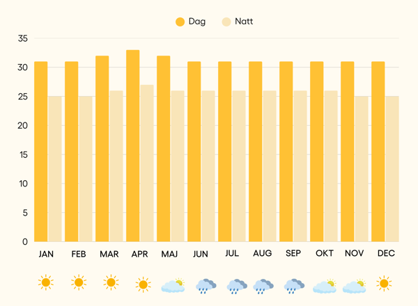 | Nattemperatur | 27 | 27 | 27 | 27 | 27 | 27 | 27 | 27 | 27 | 27 | 27 | 27 |