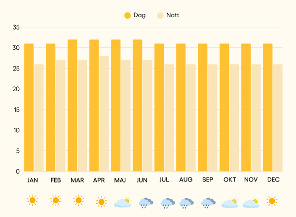 | Dagstemperatur | 30 | 30 | 31 | 32 | 31 | 31 | 30 | 30 | 30 | 30 | 30 | 30 |