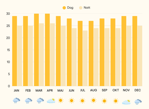 Vädret på de 116 paradisöarna är som regel stabilt eftersom de inte ligger i ett cyklonbälte och därmed oftast slipper de värsta ovädren. Men notera att det kan komma korta skyfall under hela året, precis som på alla andra platser i tropikerna.